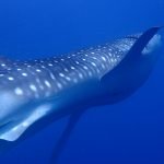 Whale Sharks are the biggest fish in the the world. The term “whale” refers to their size. Real whales are mammals; they do not have gills; rather, they breath air and are warm-blooded. Whale sharks are fish: they have gills, so they draw oxygen from water and are cold-blooded. Whale sharks are no danger to humans. They eat plankton (microscopic plants) and tiny fish and shrimp. Adult males grow to approximately 8 to 9 meters (26 to 29 feet) in length and females grow to approximately 15 meters (49 feet) in length.