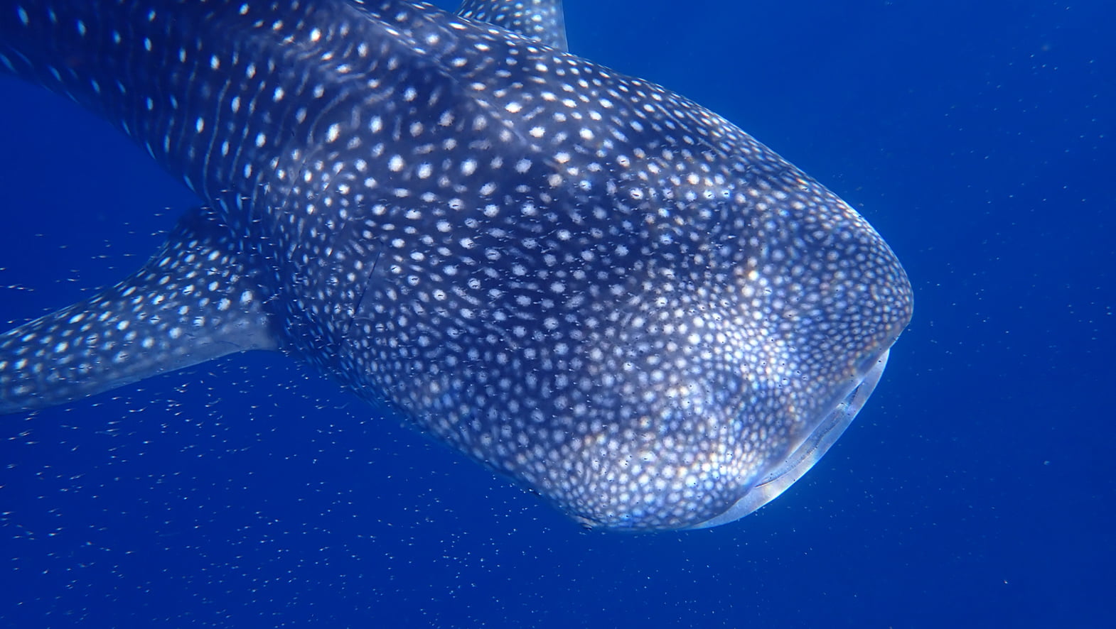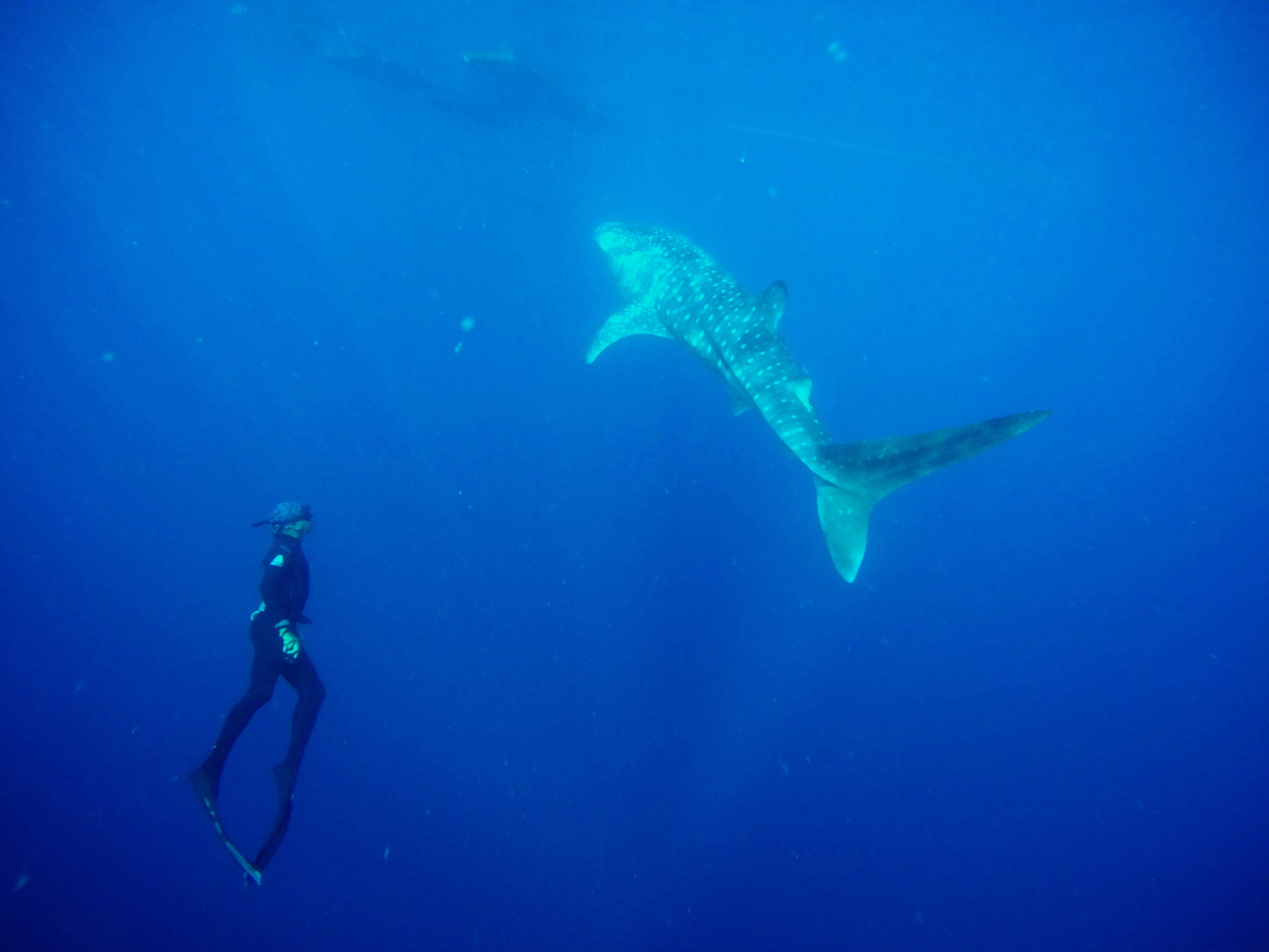 Whale Sharks are the biggest fish in the the world. The term “whale” refers to their size. Real whales are mammals; they do not have gills; rather, they breath air and are warm-blooded. Whale sharks are fish: they have gills, so they draw oxygen from water and are cold-blooded. Whale sharks are no danger to humans. They eat plankton (microscopic plants) and tiny fish and shrimp. Adult males grow to approximately 8 to 9 meters (26 to 29 feet) in length and females grow to approximately 15 meters (49 feet) in length.